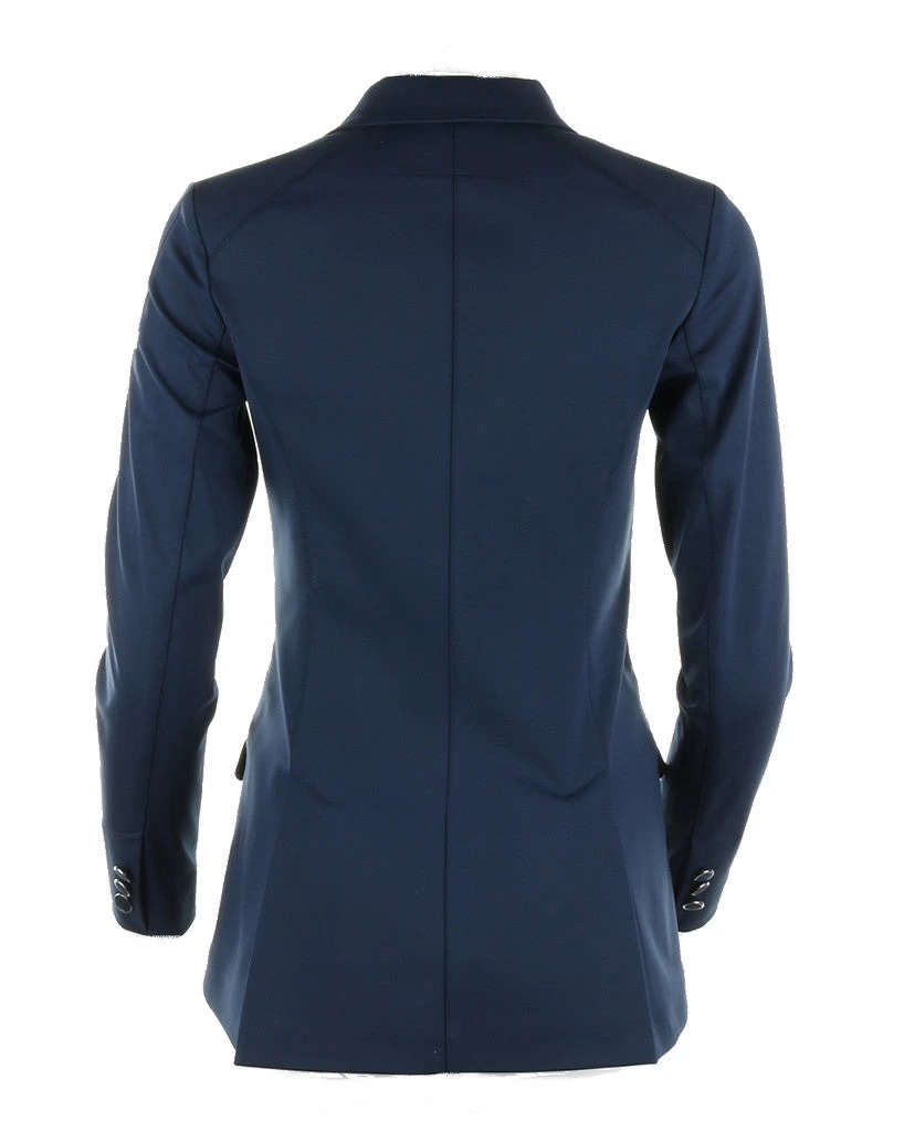 Very nicely finished riding jacket / competition jacket from Animo Italia in soft shell EVO fabric. This jacket has a zipper under the front row of buttons and three stylish dark blue buttons with a silver-colored border. The same type of buttons are placed on the sleeves for a nice look. There are 2 back vents and the competition jacket has 2 front pockets with a flap.