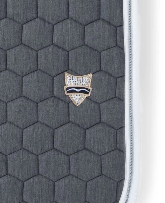 Animo saddle pad with cotton bottom with a chic emblem with Swarovski stones and gold-colored studs. This saddle is suitable for use under a jumping saddle or all purpose saddle. The saddle pad has a girth loop at the bottom. The saddle pad has a white trim, grey cord and a white thin trim on the inside.