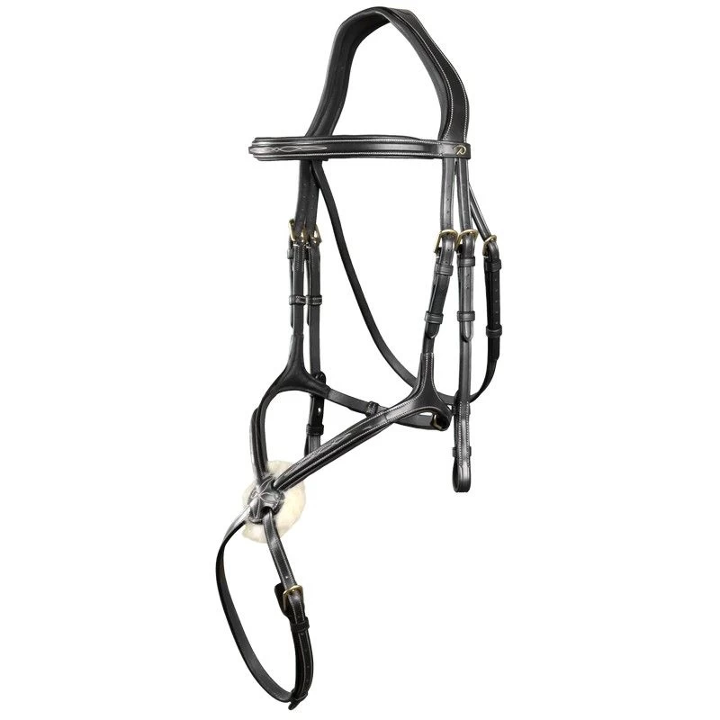 Elegant bridle from the Dyon Collection with a figure 8 noseband fastened by a brass roll buckle. The bridle has fancy stitching on the browband and the mexican noseband.