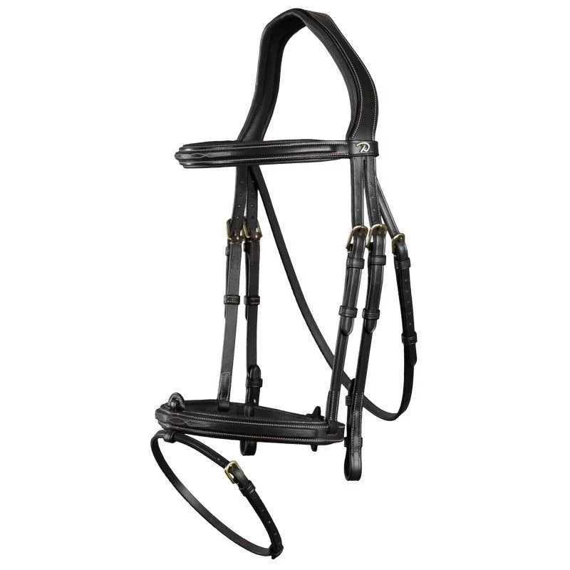 Elegant bridle with a classic flash noseband fastened by a brass roll buckle with a protective leather tab to allow precise adjustment and prevent wear.
