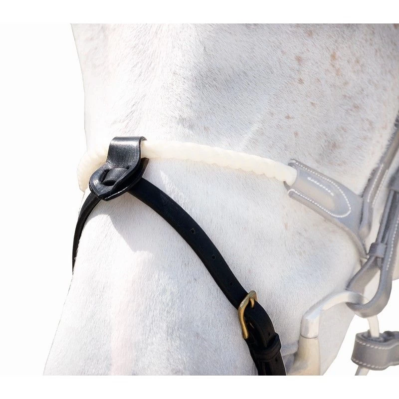 This nose strap from the Dyon Collection has 2 free loops so can be easily put on the Dyon waxed rope noseband for example . The nose strap has brass buckles like the rest of the Dyon Collection.