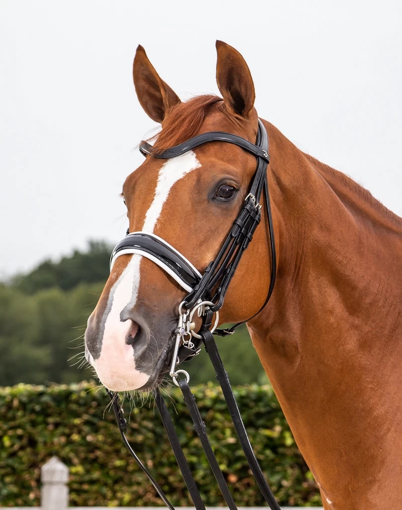 Double bridle from the top brand Dy’on. This bridle has a large patent crank noseband of 38mm wide. This is wonderfully flexible and anatomically shaped. The pull-back part rests on a soft padding for extra comfort for your horse. The noseband is patent leather with a white lining. The headpiece has an anatomical S-shape so that the ears lie nicely free.