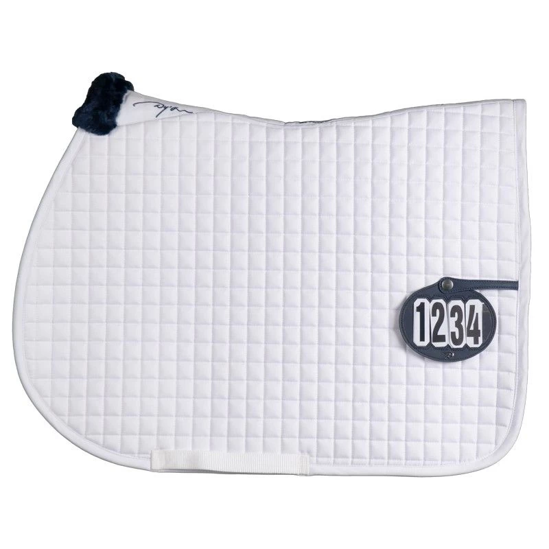 Saddle pad from Dyon with an integrated strap for a start number on the left side. This saddle pad has a sheepskin part at the withers. The matching start number is not included but can be purchased in our shop.