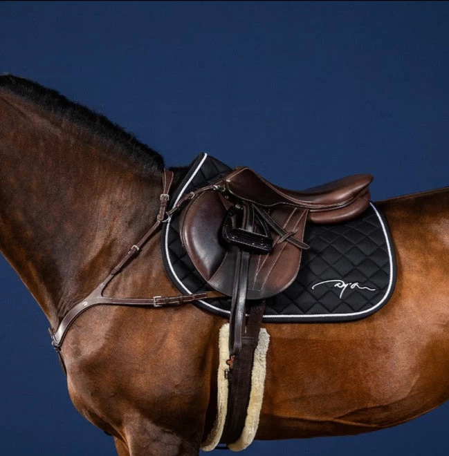 Anatomically shaped breastplate with light colored stitching from the top brand Dy’on. This harness is made in such a way that the saddle remains stable, but at the same time there is optimal shoulder freedom. The breastplate can easily be changed from a 5-point to a 4-point attachment with the part between the front legs removed. That way you can use a separate martingale, etc. next to it. The breastplate is widely adjustable. Finally, the breast collar is softly padded for extra comfort. In short, multi-purpose for both eventing and show jumping.