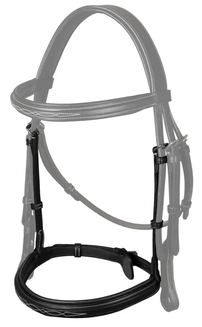 High noseband, also known as Hunter nosebeand, which fits the bridles from the Dy’on US Collection line. The noseband has cream colored stitching and stainless steel buckles.