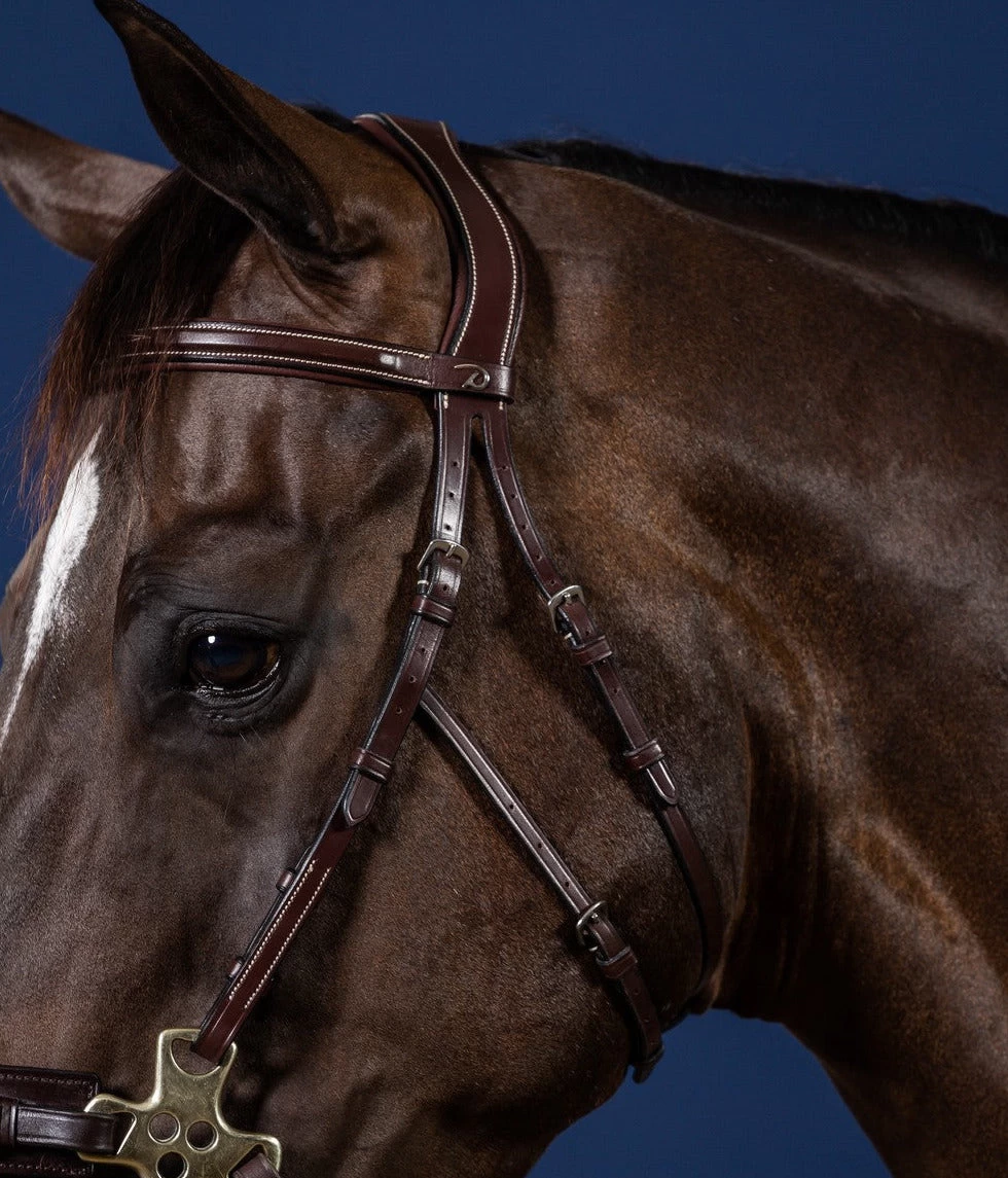 Hackamore bridle from the top brand Dy’on. This bridle only has a cheekpiece to which the hackamore can be attached. The hackamore itself is not included! An extra strap on the cheekpieces and throatlatch prevents the cheekpieces from getting into the eyes. Striking about this bridle are the light-colored stitching that gives a subtle accent and silver-colored buckles. In addition, the headpiece is anatomically shaped and the ears remain nicely free.