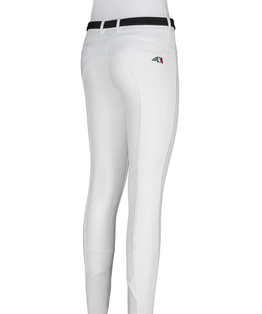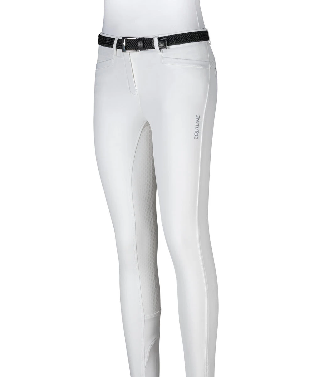 Junior Equiline riding breeches for girls. The breeches have a full grip seat. Developed to be stretchy and breathable. Embellished with an equiline embroidery tone on tone on the leg and a three colours logo in the back pocket. Modern design characterized by tone on tone stretch fastening system on bottom legs. Adjustable waist (internal elasticated waistband). Machine washable.