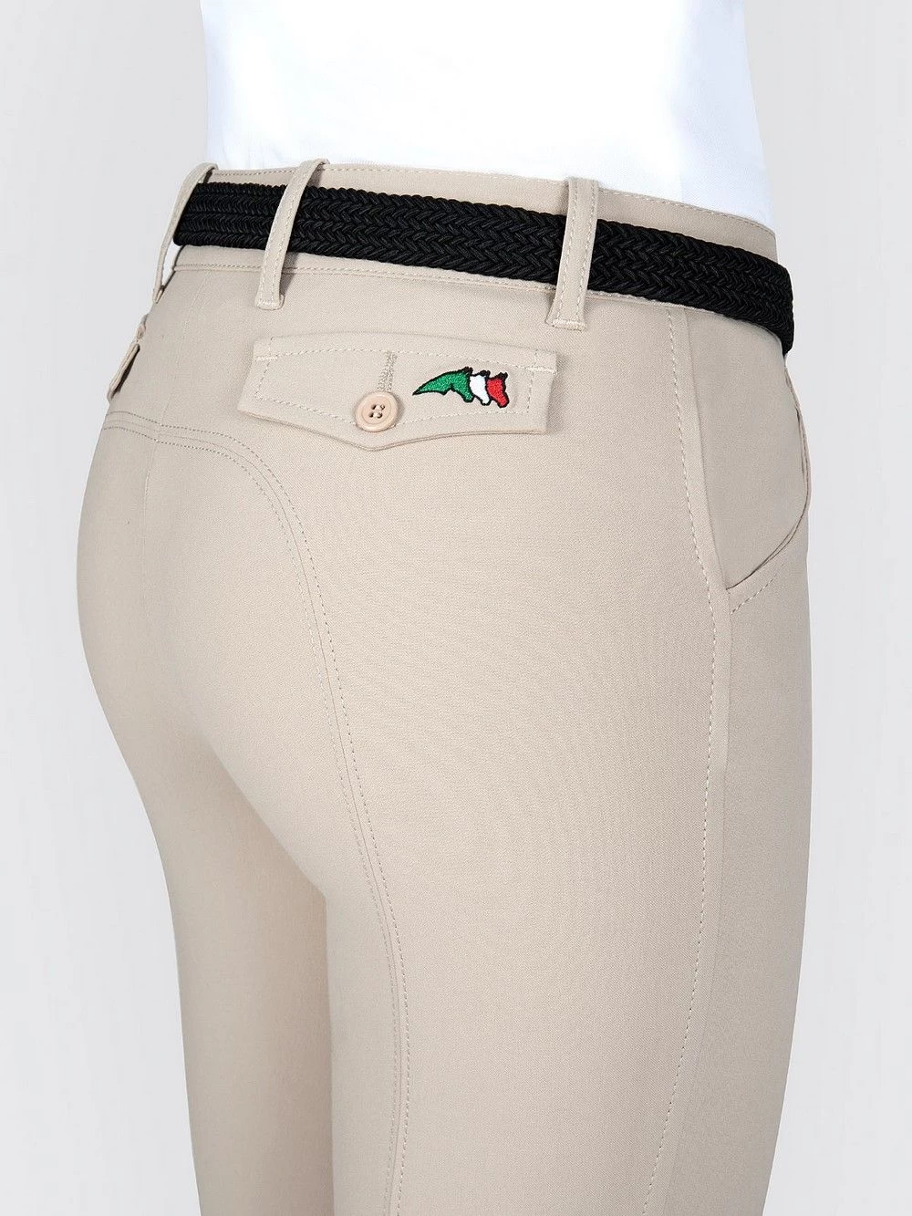 These beautiful women’s riding breeches from Equiline have grip on the knee and are a combination of the Ash model with the blind flap pockets on the back, such as the Boston model. At the bottom is lycra instead of Velcro, so that the pants fit nicely. The pants have 2 side pockets on the front. These riding breeches are standard and continuously available in white, dark blue and light beige.