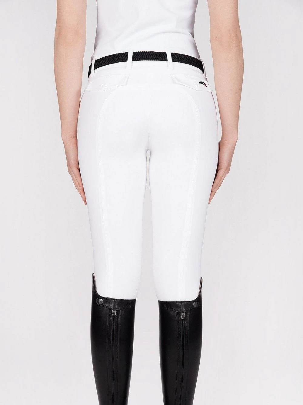 These beautiful women’s riding breeches from Equiline have grip on the knee and are a combination of the Ash model with the blind flap pockets on the back, such as the Boston model. At the bottom is lycra instead of Velcro, so that the pants fit nicely. The pants have 2 side pockets on the front. These riding breeches are standard and continuously available in white, dark blue and light beige.