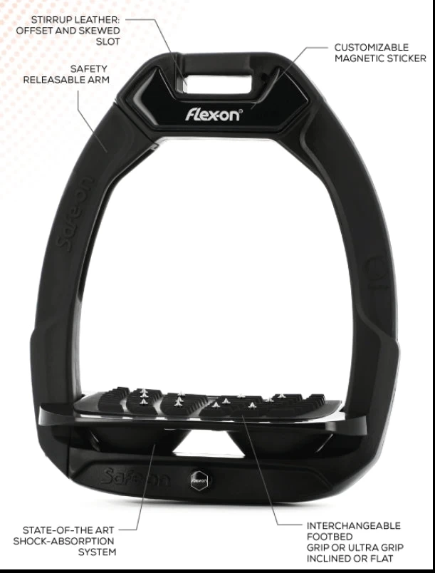The Safe-On version takes safety stirrups to a new level. With these stirrups you have the advantages of the Flex-on stirrups and also the advantage that they open in the event of a fall. After a fall, you can easily put them back together without needing new parts. The opening part is a flexible rubber closure that only opens in the event of a fall and not while riding.