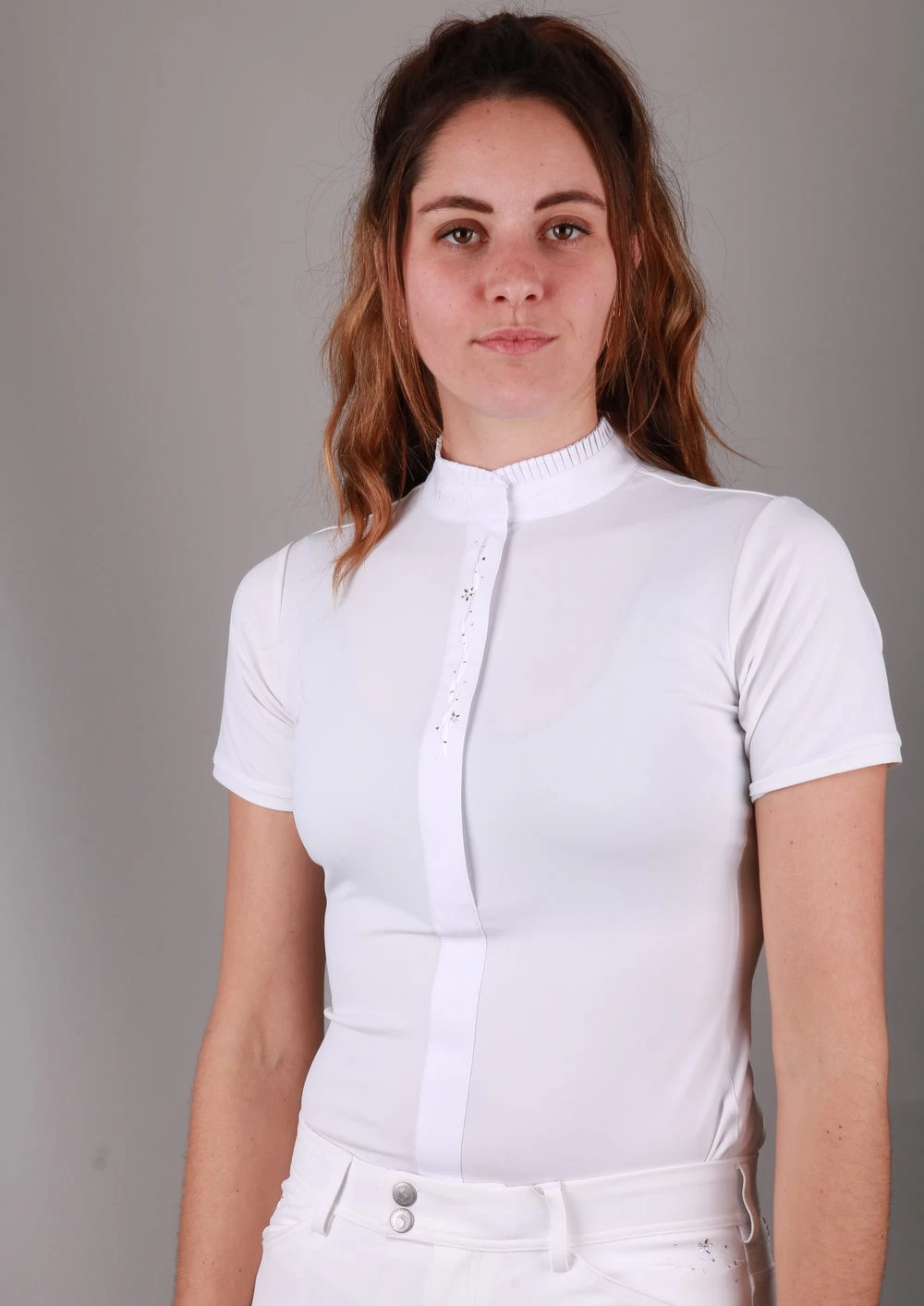 The Juliette Flower Jewellery shirt is beautifully feminine and delicate in it’s design, with a soft pleated collar and flower style embroidery and crystal decor down the front, which sits on top of the hidden zipper. Made from a technical, quick drying fabric that is UV protected and also offers ultimate freedom of movement, so the rider can feel comfortable at all times. Easy care, machine washable at 30′.