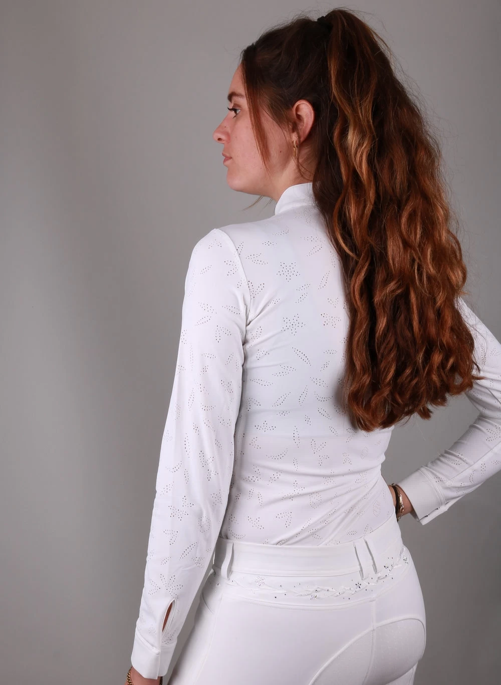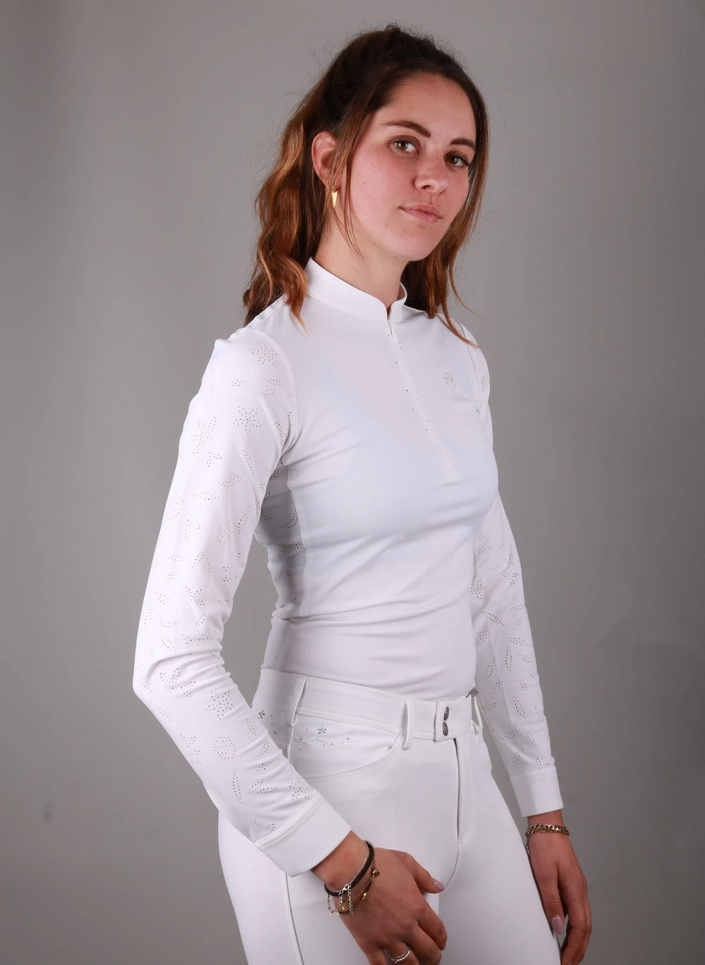 The Louison long sleeve competition shirt has a stunning custom Samshield perforation across the reverse and arms of the garment, creating an elegant ‘leaves in the wind’ effect. The dipped collar at the front, hidden zipper and Swarovski decor add to the feminine feel. The Italian material is a high stretch, breathable, technological fabric that wicks away sweat to keep the rider dry and comfortable. UV protection maintains the quality of the fabric and protects the riders skin in the summer months. Easy care, machine washable at 30’C and made in an eco conscientious manner.