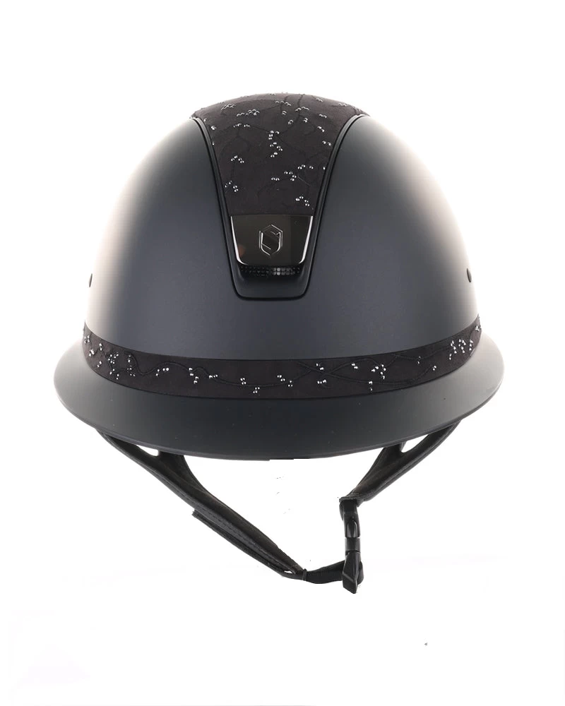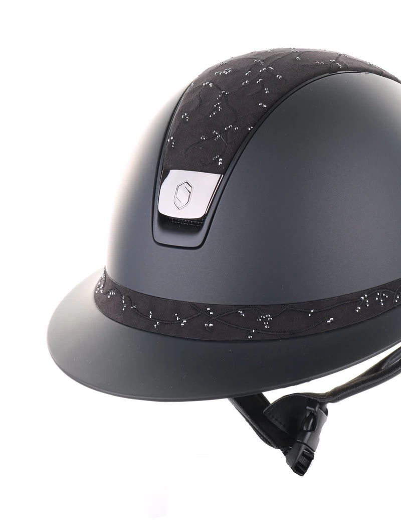Inspired by women classic riding helmets the Miss Shield Shadowmatt is equipped with a long visor and a customizable frontal band.