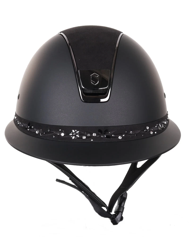Inspired by women classic riding helmets the Miss Shield Shadowmatt is equipped with a long visor and a customizable frontal band.