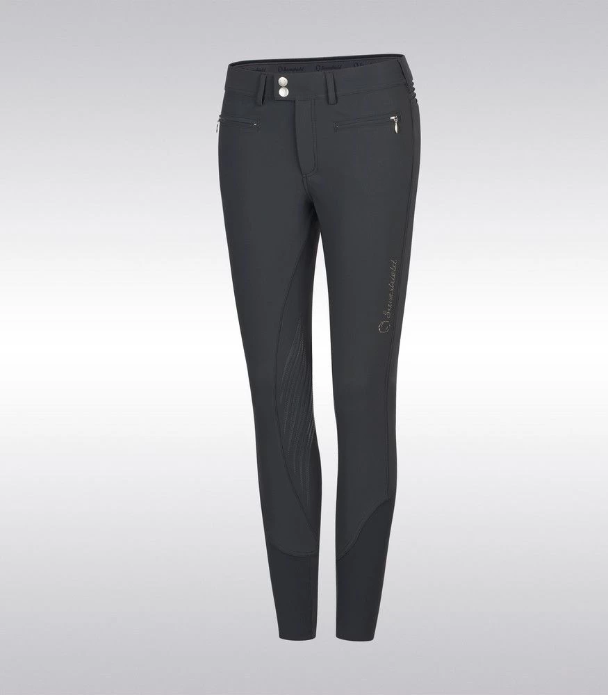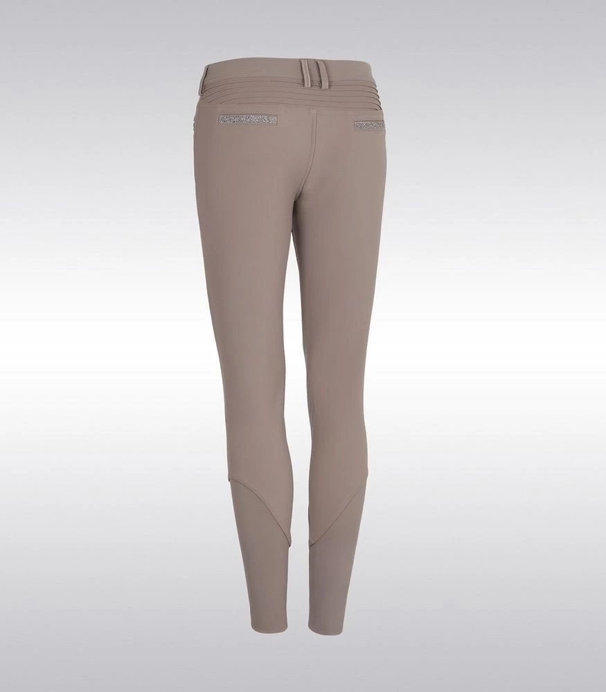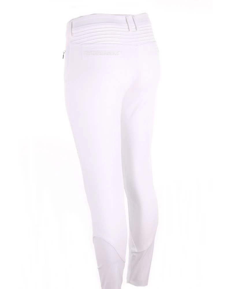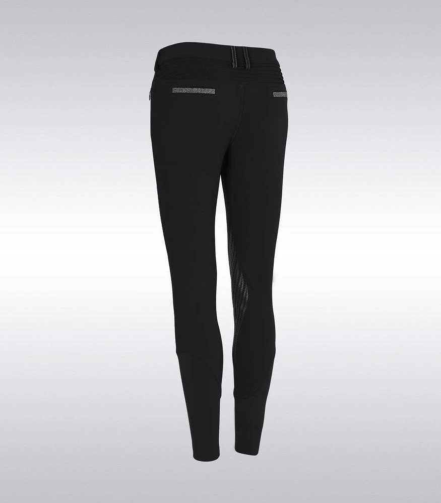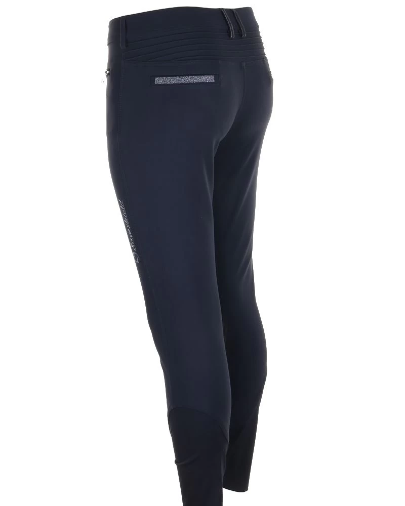 The silicone knee grip ensures stability and adherence in the saddle. The compression fabric offers a perfect fit of the breeches. The elastic tape inside the belt is equipped with silicone which prevents the shirt from rising. Thanks to the special construction of the fabric the Adèle breeches offer protection against ultraviolet rays. The breeches are embellished with a Swarovski® Samshield logo on the rider’s thigh and Crystal Fabric Swarovski® on the back pockets combining technical performance and elegance.