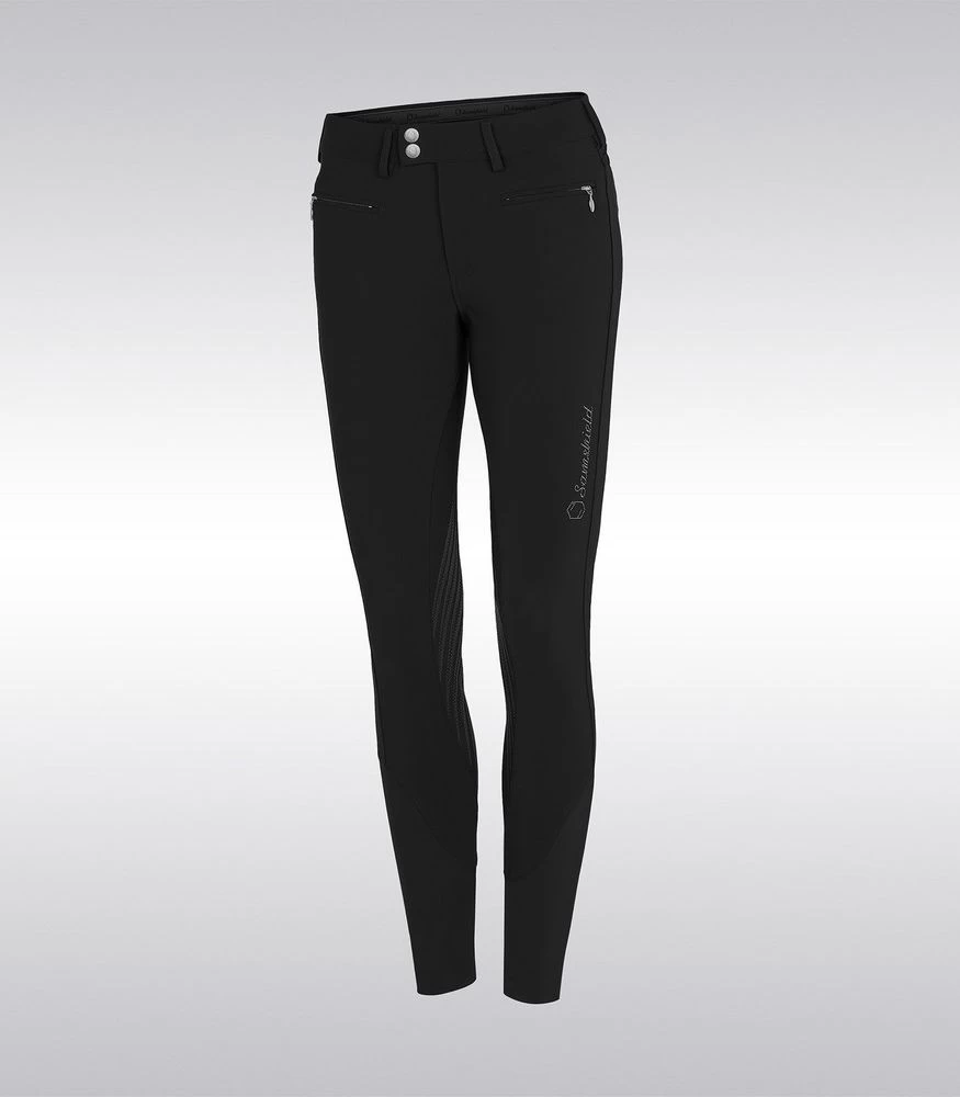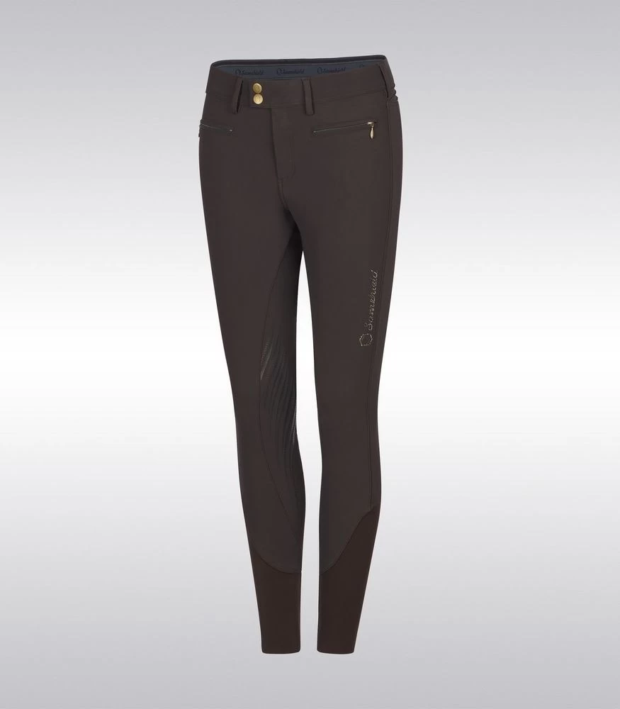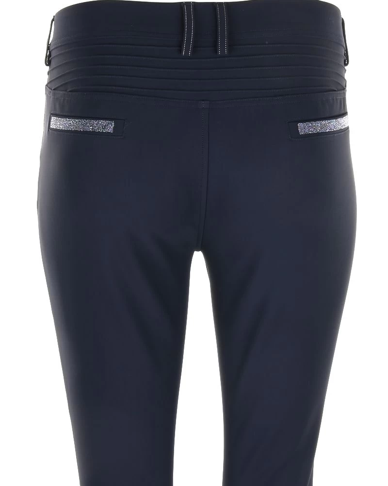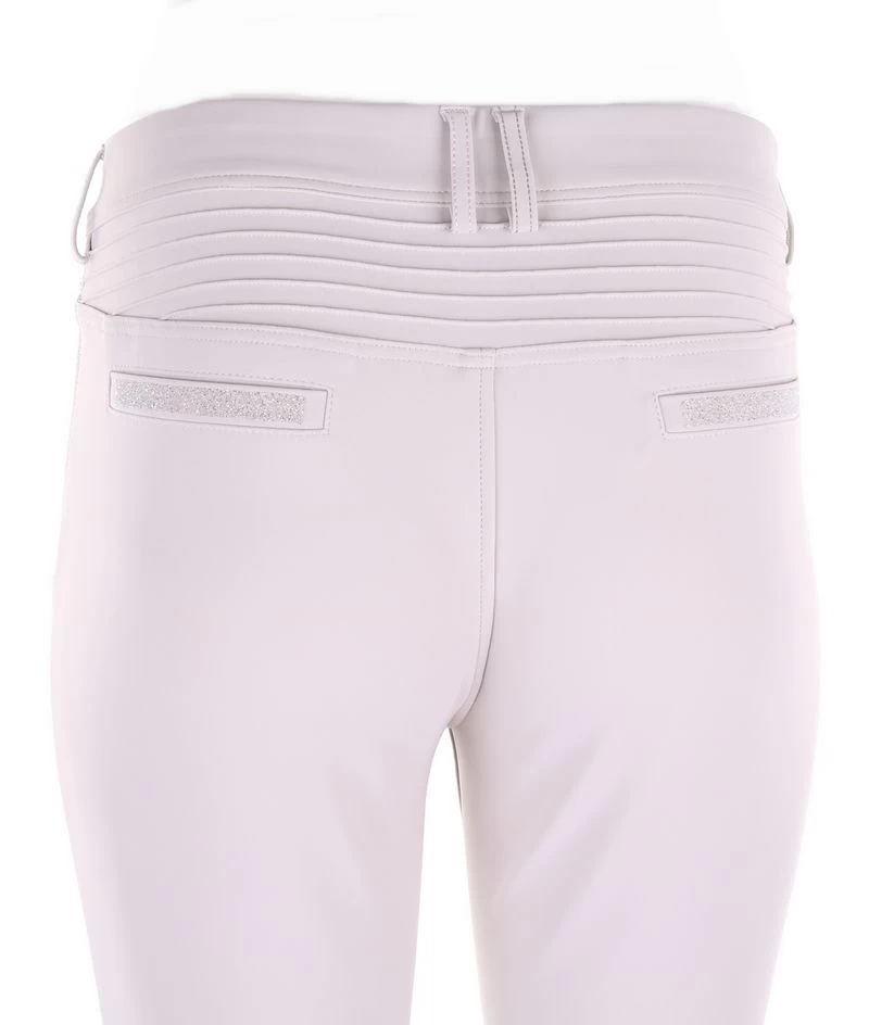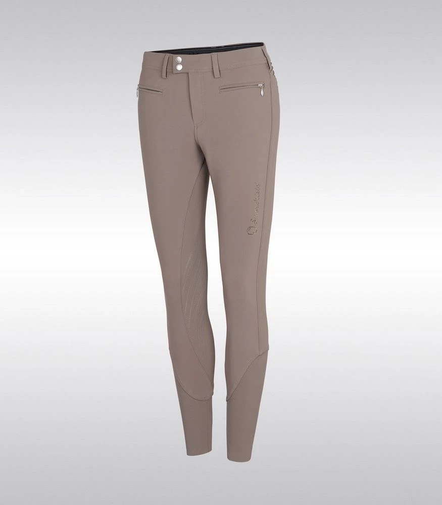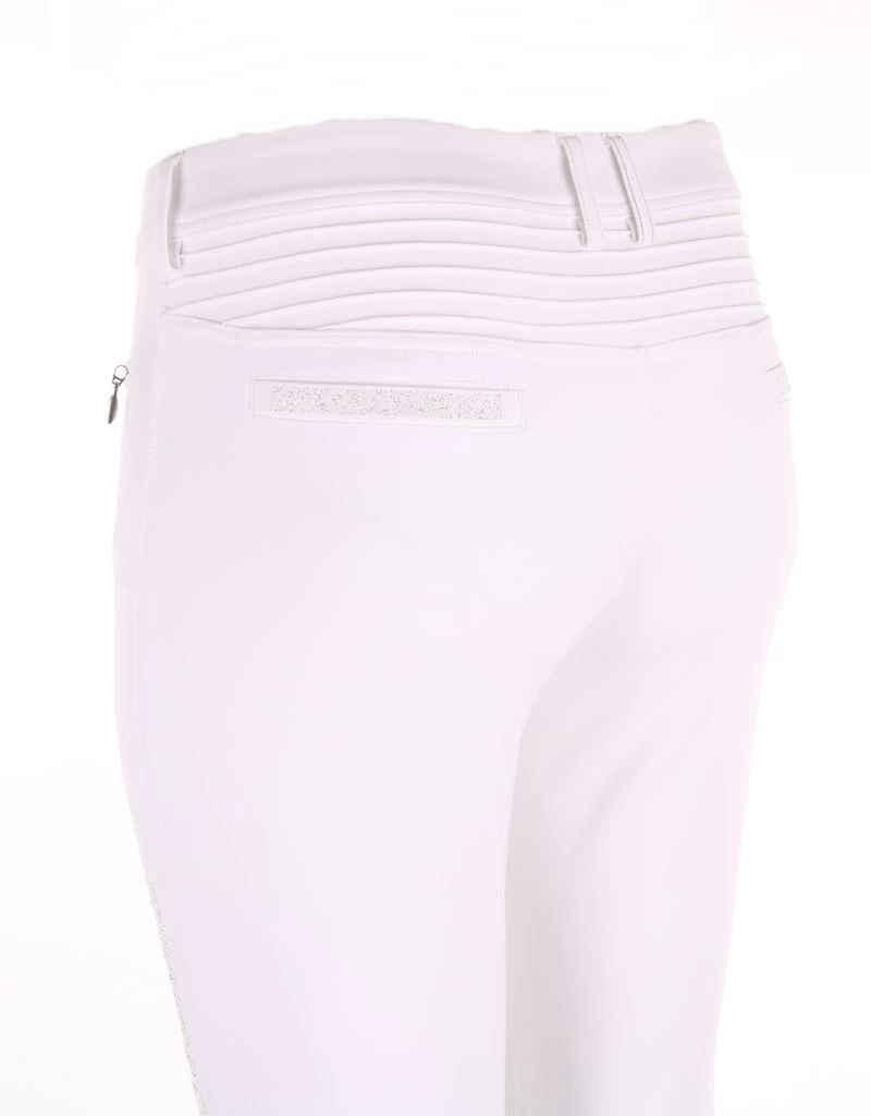 The silicone knee grip ensures stability and adherence in the saddle. The compression fabric offers a perfect fit of the breeches. The elastic tape inside the belt is equipped with silicone which prevents the shirt from rising. Thanks to the special construction of the fabric the Adèle breeches offer protection against ultraviolet rays. The breeches are embellished with a Swarovski® Samshield logo on the rider’s thigh and Crystal Fabric Swarovski® on the back pockets combining technical performance and elegance.