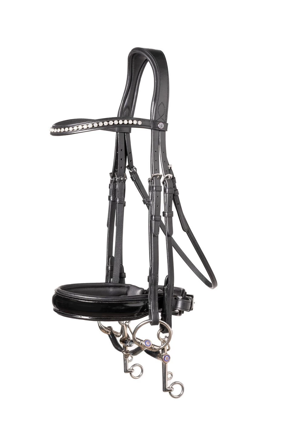 The double bridle TRUST Aachen is in a class of its own. The stylish bridle has a beautiful finish and a nice fit. The TRUST Aachen has a patent leather and anatomic crank noseband that is reinforced with nylon to prevent stretching. The noseband padding extends beyond the noseband so that the buckles can never touch the horse’s head. The browband is fitted with the purest quality Stellux™ stones, which gives it an elegant look. These stones are deep-set, so they do not fall out. The headpiece is anatomically shaped and cut back for more freedom at the ears. The padding of the headpiece is soft but not too thick, so that there is direct contact with the horse. The TRUST Aachen is a must-have bridle for the dressage rider!