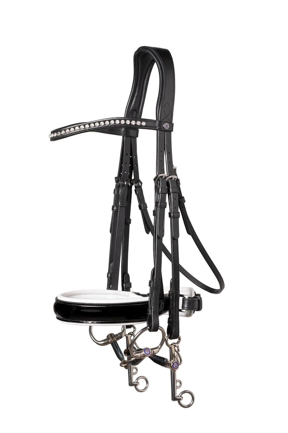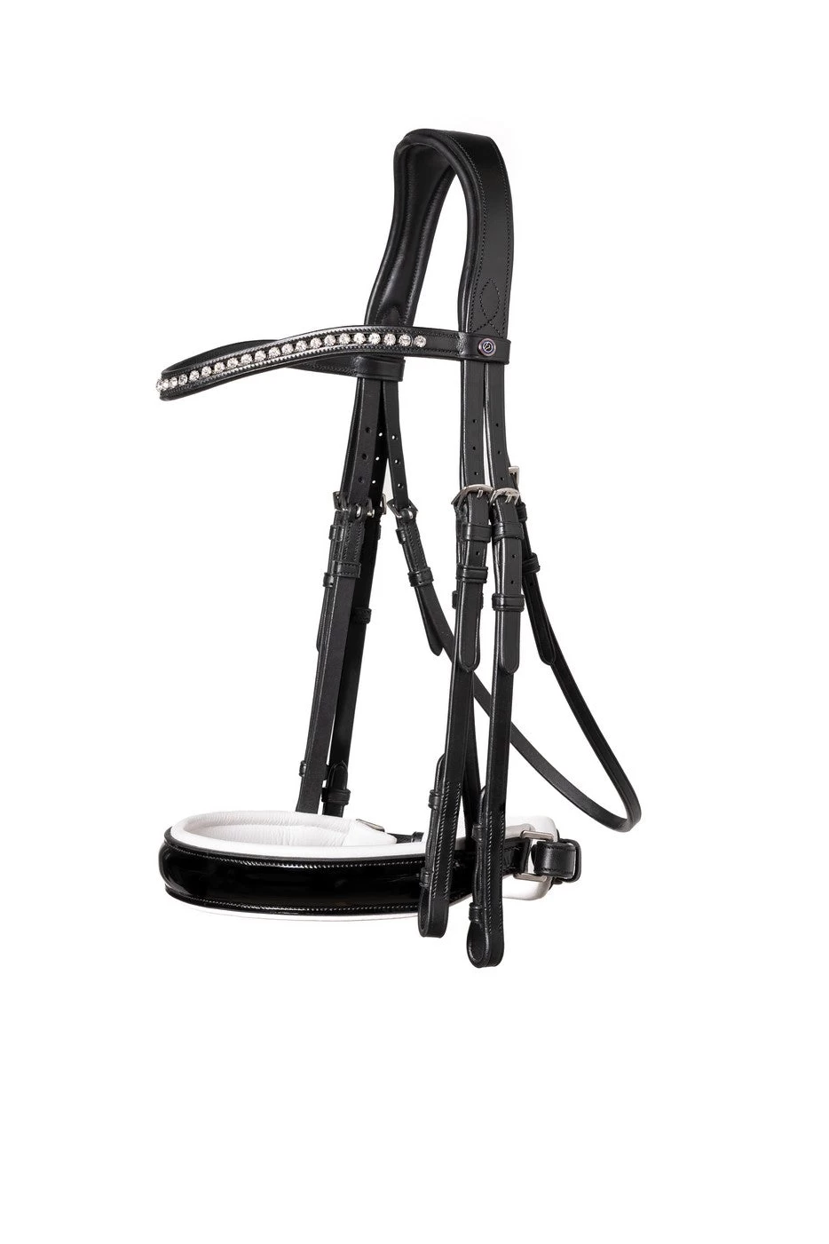 The bar and snaffle bridle TRUST Aachen is in a class of its own. The stylish bridle has a beautiful finish and a nice fit. The TRUST Aachen has a patent leather and anatomic crank noseband that is reinforced with nylon to prevent stretching. The noseband padding extends beyond the noseband so that the buckles can never touch the horse’s head. The browband is fitted with the purest quality Stellux™ stones, which gives it an elegant look. These stones are deep-set, so they do not fall out. The headpiece is anatomically shaped and cut back for more freedom at the ears. The padding of the headpiece is soft but not too thick, so that there is direct contact with the horse. The TRUST Aachen is a must-have bridle for the dressage rider!