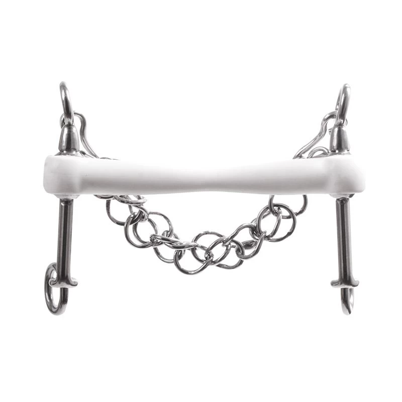 A baby weymouth fixed is used together with a bradoon, the so-called double bridle. This combination is used in the higher dressage classes. The weymouth is a cheekpiece with leverage. The longer the shanks the sharper the effect. The baby weymouth fixed has short shanks and therefore is a milder bit than the normal weymouth fixed. For a double bridle combination a special bridle or an extra cheekpiece is required. In addition, this bit must always be combined with a curb chain to prevents the bit from rotating too far in the horse’s mouth. This bit is not suitable for the inexperienced rider.