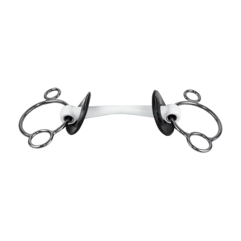 A 2.5 ring bit is a milder version of a 3 ring (pessoa) bit. With this bit a leverage can be created. The lower the reins are placed, the stronger the bit becomes. An ideal bit for horses that are very strong or hold the bit. Compared to the 2.5 eggbut, the loose rings can move loosely so there is more movement in the bit and the rein aid has a more indirect effect.