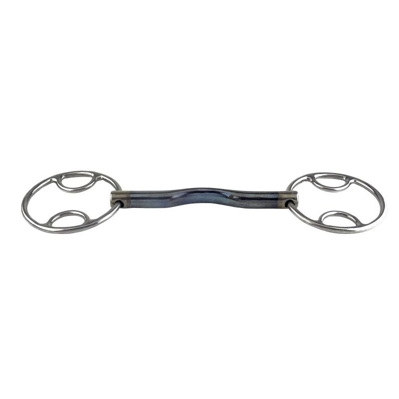 This bit has two half rings in the cheekpiece which gives more control than normal rings. The beval has several options for attaching the reins so you can decide how much pressure you want to apply. The cheekpiece is attached to the upper half ring and the reins can be attached to the large ring or to the lower half ring. By attaching the reins to the large ring, pressure is applied to lower the head. When the reins are attached to the lower half ring, the bit has a light leverage for better responsiveness.