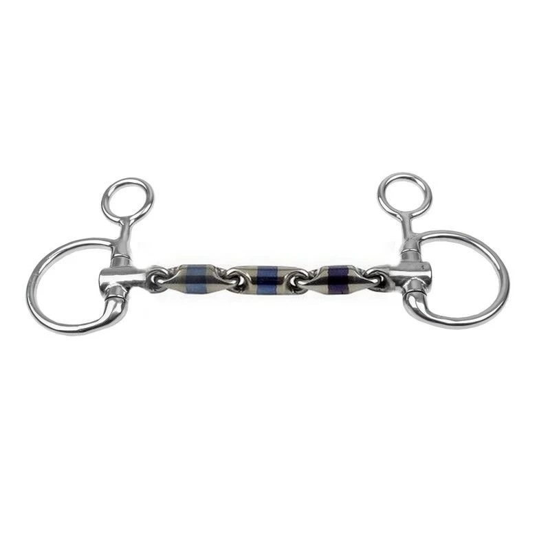 The Sweet Iron bits are made of steel and have a recognizable blue color. Sweet Iron will rust when it comes into contact with (air) humidity, the surface rust tastes sweet and naturally stimulates the saliva production. This will cause the horse to salivate more, which in turn will encourage a better acceptance of the bit.