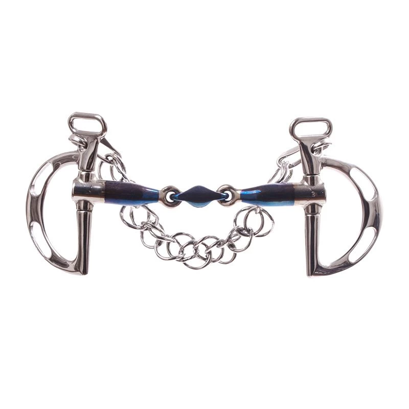 The Sweet Iron bits are made of steel and have a recognizable blue color. Sweet Iron will rust when it comes into contact with (air) humidity, the surface rust tastes sweet and naturally stimulates the saliva production. This will cause the horse to salivate more, which in turn will encourage a better acceptance of the bit.