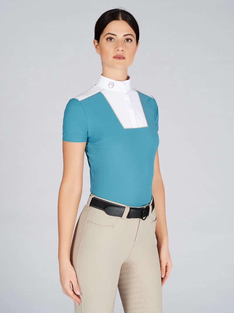Women’s competition shirt made of lightweight and breathable fabric that does not require ironing and “sunblock”, able to protect against sunlight. The polo shirt is ideal for summer competitions thanks to the breathable poplin bib with contrasting piping and the micro-perforated fabric on the shoulders. Poplin collar. The competition shirt is closed at the front by means of hidden press studs.