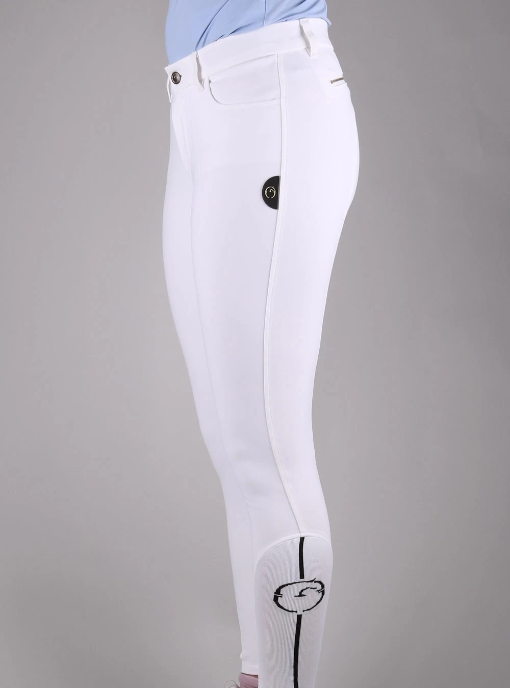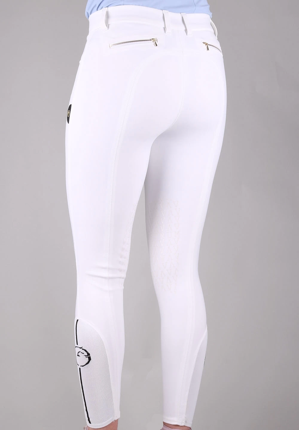 Ladies riding breeches Giglio made of bi-elastic fabric that guarantees a perfect fit and comfortable wearing comfort. Equipped with V-shaped knee grip for extra stability in the saddle, two back pockets with a zipper. Small black emblem with Vestrum logo on the left upper leg. These riding breeches have a zipper and button closure system on the front.
